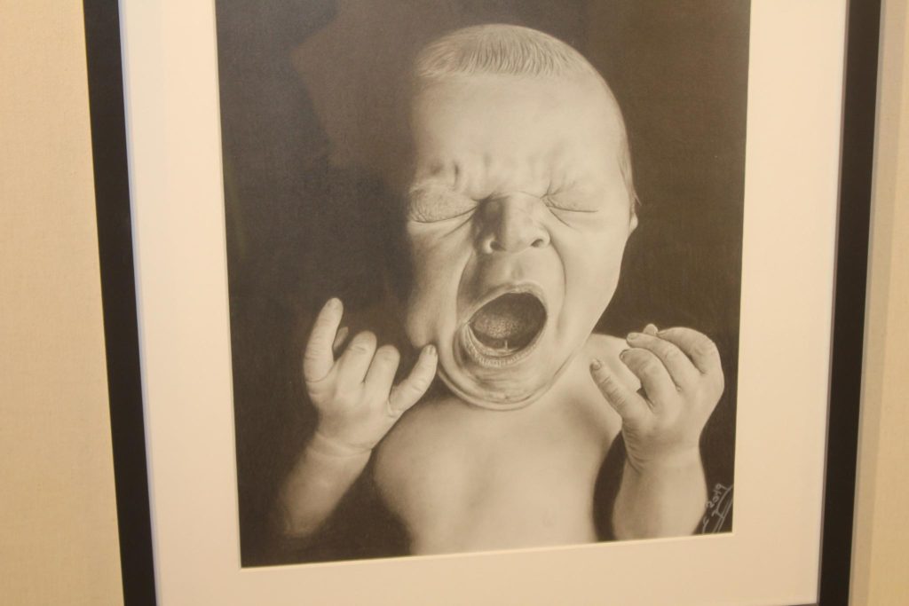V čem je tato černočerná tužka jiná než klasická? „Tužek je mnoho. Černá tužka není na mých kresbách úplně černá. Je to taková grafitová barva, tmavě šedivá. Nemůžu dosáhnout úplné té černosti, i když já to dokážu do toho papíru zakomponovat, že to působí černě, ale pořád to není úplně černé. Když se podíváte na obraz vzadu na stěně, tak kruh v něm je jinak černý než to okolí. Je dělán touto tužkou,“ prozradila Eva Bernadeta.