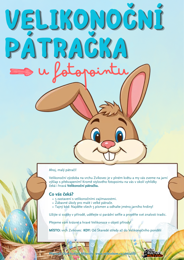 Dům kultury Milevsko si pro malé dobrodruhy nachystalo na velikonoční prázdniny Velikonoční pátračku k fotopointu! Vyrazte na jarní výšlap k fotopointu na vrchu Zvíkovec a užijte si Velikonoční pátračku plnou zábavy. Ta probíhá od středy 1. dubna až do Velikonočního pondělí a je ideální pro malé i větší zvídavé návštěvníky. Cestou k fotopointu na vás čeká pět zastavení, kde si vyzkoušíte zábavné úkoly a dozvíte se zajímavosti o velikonočních tradicích. Na konci vás čeká odměna v podobě selfíčka u velikonočně vyzdobeného fotopointu.