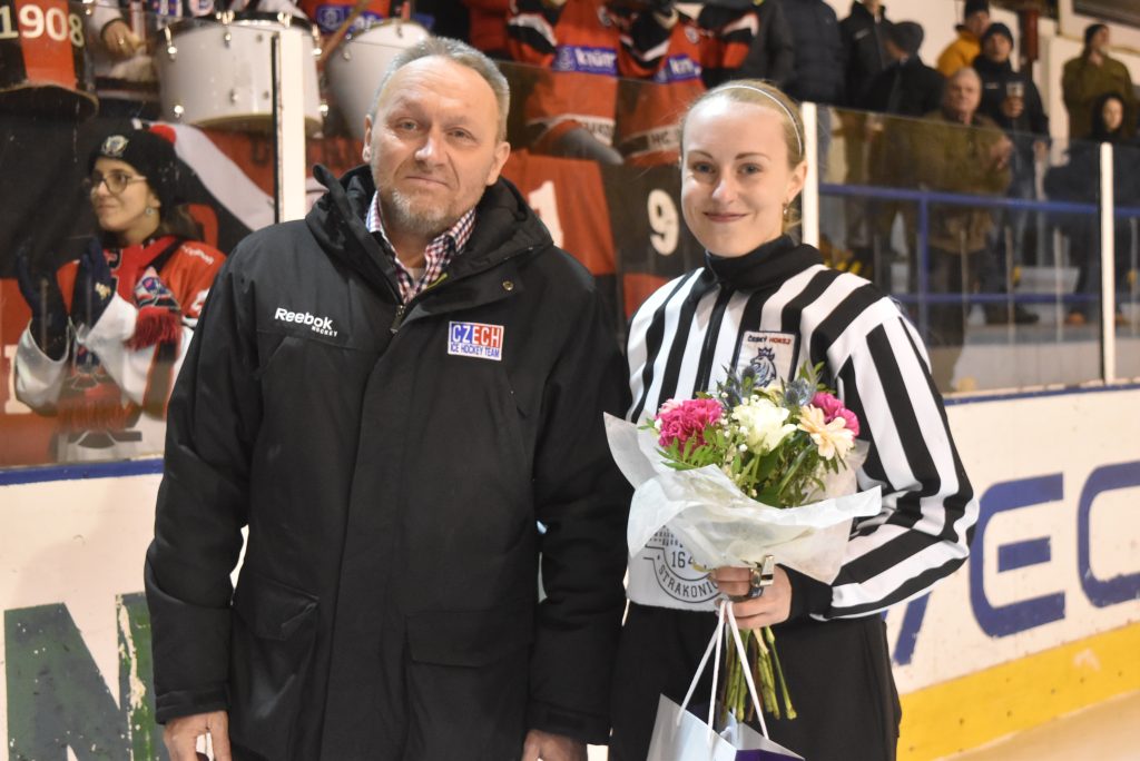 STRAKONICE – V pátek 13. února byla rozhodčí Eliška Bublíková oceněna před zahájením úvodního čtvrtfinále play-off mezi Strakonicemi a Radomyšlí za vzornou reprezentaci jihočeského hokeje, poděkování převzala z rukou předsedy krajské komise rozhodčích Milana Veselého. Za tři roky své kariéry v pruhovaném dresu mladá slečna ze Strakonic, která se také coby trenérka věnuje krasobruslení, odpískala přibližně 250 utkání – od mládežnických soutěží po krajskou ligu mužů a reprezentační zápasy žen. Historickým vrcholem její kariéry je letošní účast na mistrovství světa žen do 18 let divize 1A v Itálii, kde se stala první rozhodčí z Jihočeského kraje, která se na mistrovství světa probojovala.