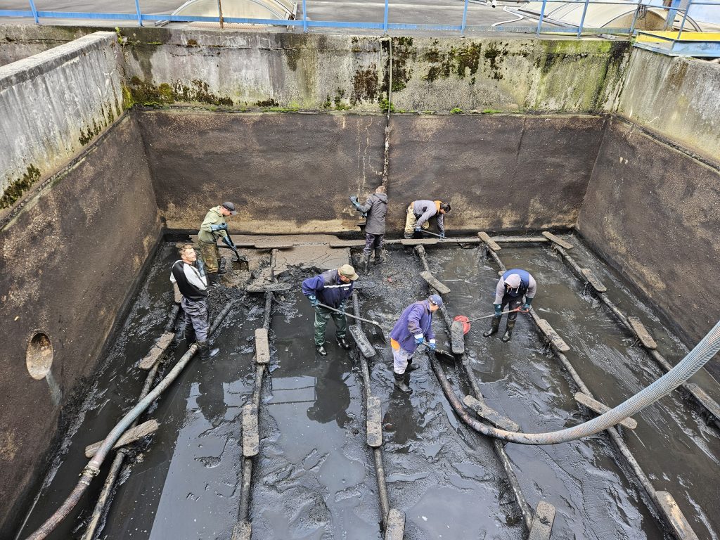 Práce na samotné výměně systému provzdušňování začaly již před několika dny, bylo totiž třeba aktivační nádrž vypustit, manuálně vyčistit pomocí tlakové vody a zbytky kalu odvézt k likvidaci. Práce pak pokračovaly vyčištěním celého systému rozvodu vzduchu a výměnou 144 koncových membrán.