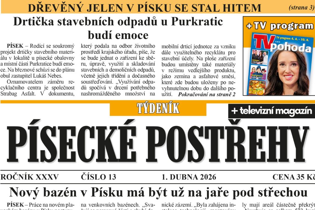Nový bazén v Písku má být už na jaře pod střechou ■ Drtička stavebních odpadů u Purkratic budí emoce ■ Martin Brož skončí u píseckých Pirátů, ale kandidovat bude ■ Protivín a Semice zvítězily, Mirovice neuspěly v Třeboni. Najdete ohlasy trenérů ■ Sršni nestačili Ústí, pak smázli Ostravu. Jak zápasy hodnotil asistent Matěj Mach? ■ Házenkářky padly v Mostě, co duel ukázal Kateřině Hromádkové? ■ Florbalisté budou doma odvracet sestup! Michal Hanzlík prozradil, v čem byl soupeř lepší