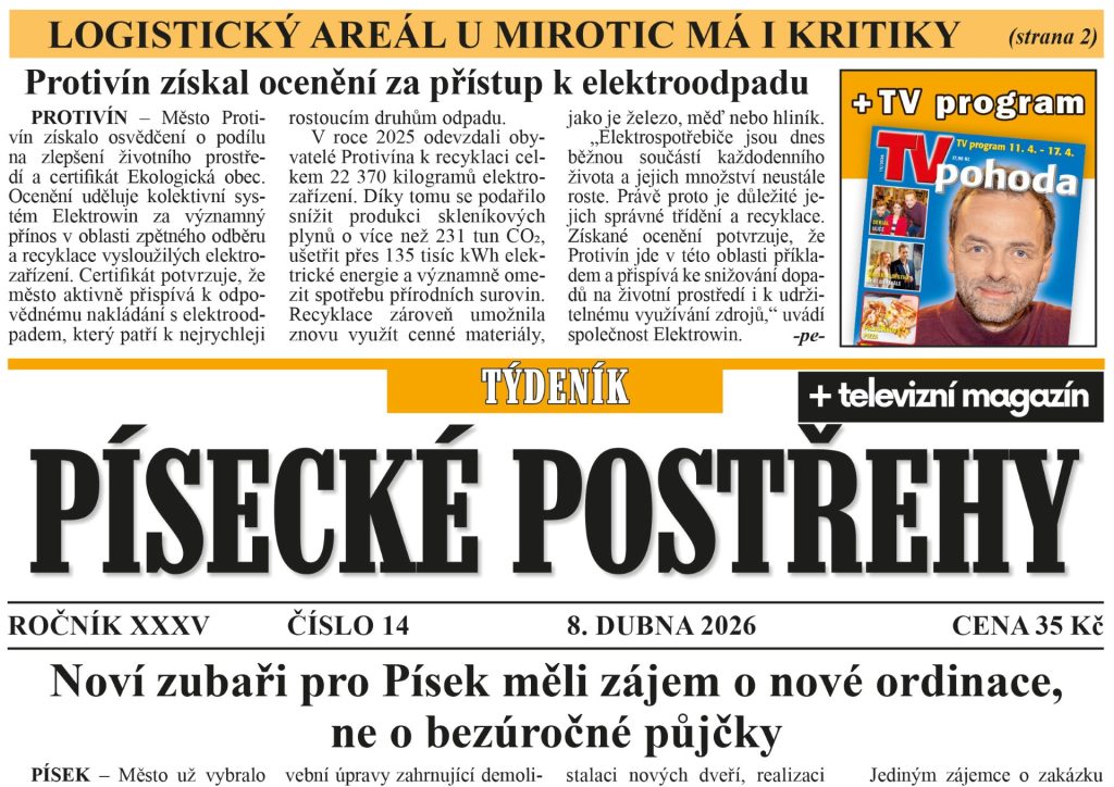 O stavbu zubařských ordinací v Písku měla zájem jen jedna firma ■ Logistické centrum u Mirotic má i odpůrce ■ Jsou městské stavební pozemky u Smrkovic příliš drahé? ■ Sršni se stěhují na zimák! Vyzpovídali jsme hlavního organizátora Jana Šturce. Co všechno je pro přesun nutné udělat? ■ Házenkářky se na play off naladily výhrou nad lídrem soutěže ■ Florbalisté sestup neodvrátili, co rozhodlo podle Michala Hanzlíka?