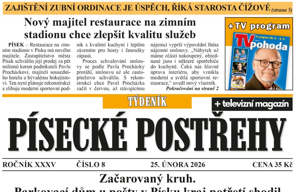 Kraj potřetí shodil projekt parkovacího domu u pošty v Písku ■ Ordinace zubařky v obci je úspěch, říká starosta Čížové ■ Restauraci na zimním stadionu v Písku koupil bývalý hokejista ■ Velký rozhovor s Monikou Pekařovou! Proč motokrosu v Klukách odzvonilo? ■ Házenkářky porazily Porubu. Kateřina Hromádková prozradila, co by se týmu mohlo vymstít proti lepším soupeřům ■ Druhá futsalová liga má před sebou boj o medaile. S čím do finále půjdou Delfíní a Wanasto? ■ Šance hokejistů na play off definitivně zhasla