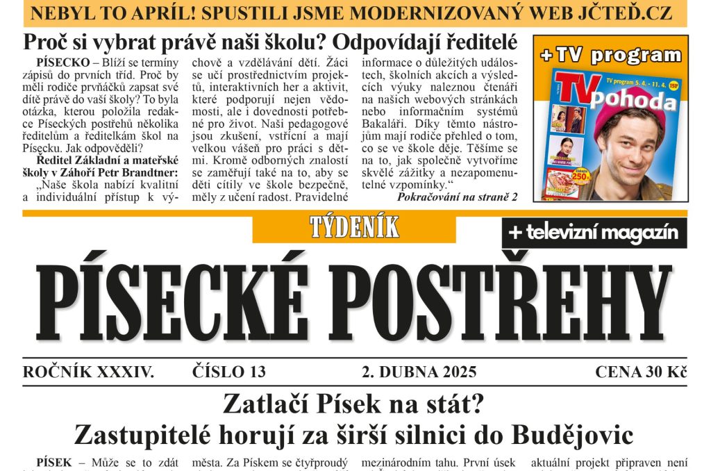 Zastupitelé Písku horují za širší silnici do Budějovic ■ Jak nalákat prvňáčky do škol? Ředitelé promluvili ■ Nová chovatelská hala v Záhoří začíná fungovat ■ K postupu zbývá krok! Písečtí florbalisté zvládli domácí finálové zápasy ■ Fotbalisté Protivína remizovali s Roudným. Co byla škoda podle Pavla Burdy? ■ Házenkářky uspěly v Olomouci. Jak vidí odvetu Kateřina Hromádková? ■ Sršni dvakrát prohráli. Kouč Jan Čech prozradil, co ho štvalo