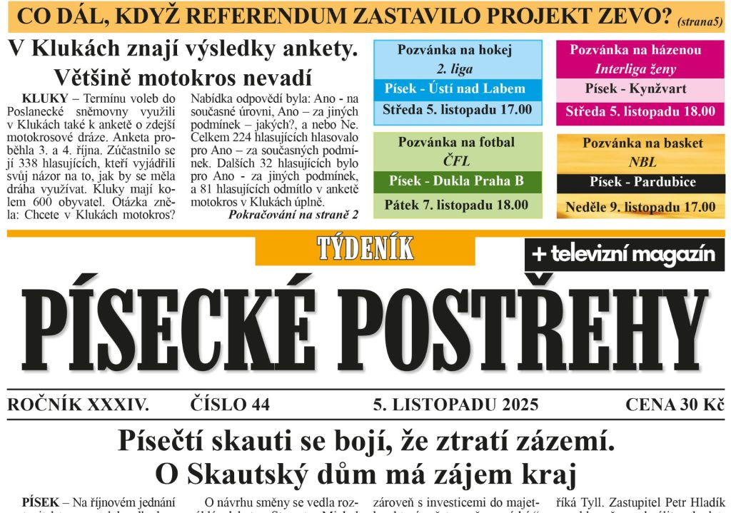 Skauti v Písku se bojí, že ztratí zázemí. O skautský dům usiluje kraj ■ Občané Kluk se vyjádřili k fungování motokrosové trati ■ Bytový dům na Hradišti zatím nedostal zelenou ■ Písečtí fotbalisté v Kladně tvrdě narazili. Kde byla příčina vysoké prohry podle Milana Nouska? ■ Semice nestačily na Sezimovo Ústí. Brankář Jakub Pokorný, prozradil, proč se týmu nedaří ■ Florbalisté vyzráli na Šumperk. Za co hráče pochválil Michal Hanzlík? ■ Sršni porazili Děčín, potom prohráli v Brně. Nechybí pozápasové ohlasy