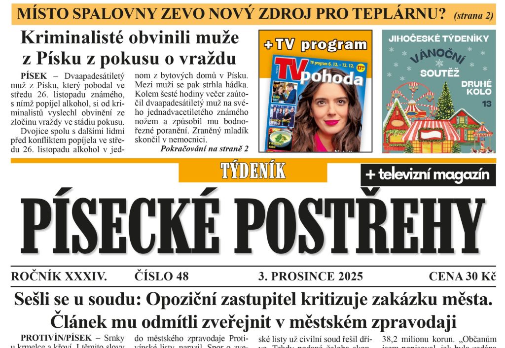 Zastupitel Protivína dohnal spor o nezveřejněný článek ve zpravodaji až k soudu ■ Náhrada za ZEVO? Řeší se převod dotace na nový zdroj pro teplárnu ■ Zákazy ohňostrojů vyvolaly rozruch ■ Hokejisté sehráli s Příbramí vyrovnanou partii! Mezi diváky byl i kouč s extraligovými zkušenostmi Jan Tlačil. Jak se mu zápas líbil? ■ Fotbalisté Písku se přátelsky utkali s Dynamem. Trenér Milan Nousek nešetřil chválou ■ Futsalisté mají za sebou šesté kolo. Kdo se probojoval do nejlepší sestavy?