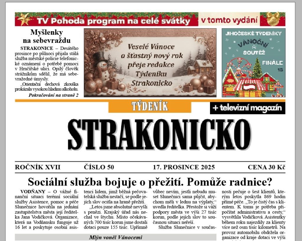 Sociální služba bojuje o přežití. Pomohou Vodňany? ■ Volyně sníží hranici plánované povodňové ochrany ■ Pomůže Blatné obchvat z průmyslové zóny? ■ Jinín má nový obecní úřad. Bezbariérový, moderní a s prostorem pro obvodního lékaře i spolky ■ Trenér florbalistů: Chybí nám větší energie a především radost ze hry ■ Kam vyrazit mezi svátky na Strakonicku za sportem?
