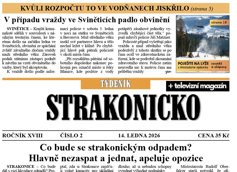 Co bude se strakonickým odpadem? Hlavně nezaspat a jednat, apeluje opozice ■ Blatná má schodkový rozpočet ■ Mají Vodňany plán investic? ■ Zlato z turnaje starších přípravek zamířilo do Blatné ■ Lyžaře čekala organizátorská výzva i závodní úspěchy ■ Boxer Milan Budoš: Rok 2025 bych nejradši poslal do temných snů