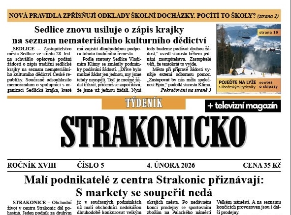 Marketům nemůžeme konkurovat, shodují se v končících obchodech v centru Strakonic ■ Nová pravidla zpřísňují odklady školní docházky. Co na to ředitelé škol? ■ Tříkrálová sbírka na Strakonicku je skokanem roku v diecézi ■ Nohejbalista roku Jakub Sekáč: Ocenění je motivací ■ Systematická práce s mládeží přináší lyžařům ovoce ■ Hokejistky zářily v premiérové sezoně dívčí extraligy