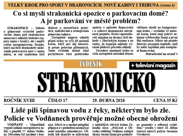 Co si myslí strakonická opozice o parkovacím domě? A je parkování ve městě problém? ■ Lidé pili špinavou vodu z řeky, některým bylo zle. Policie ve Vodňanech prověřuje možné obecné ohrožení ■ Strakonice obnoví pamětní desku Josefa Skupy ■ Brankářská krize v Katovicích pokračuje. Mezi tyče musel bývalý stoper ■ Sportovní hala STARZ ponese jméno legendárního trenéra ■ Vodní pólisté si zahrají o bronz, Stepp byl nad jejich síly