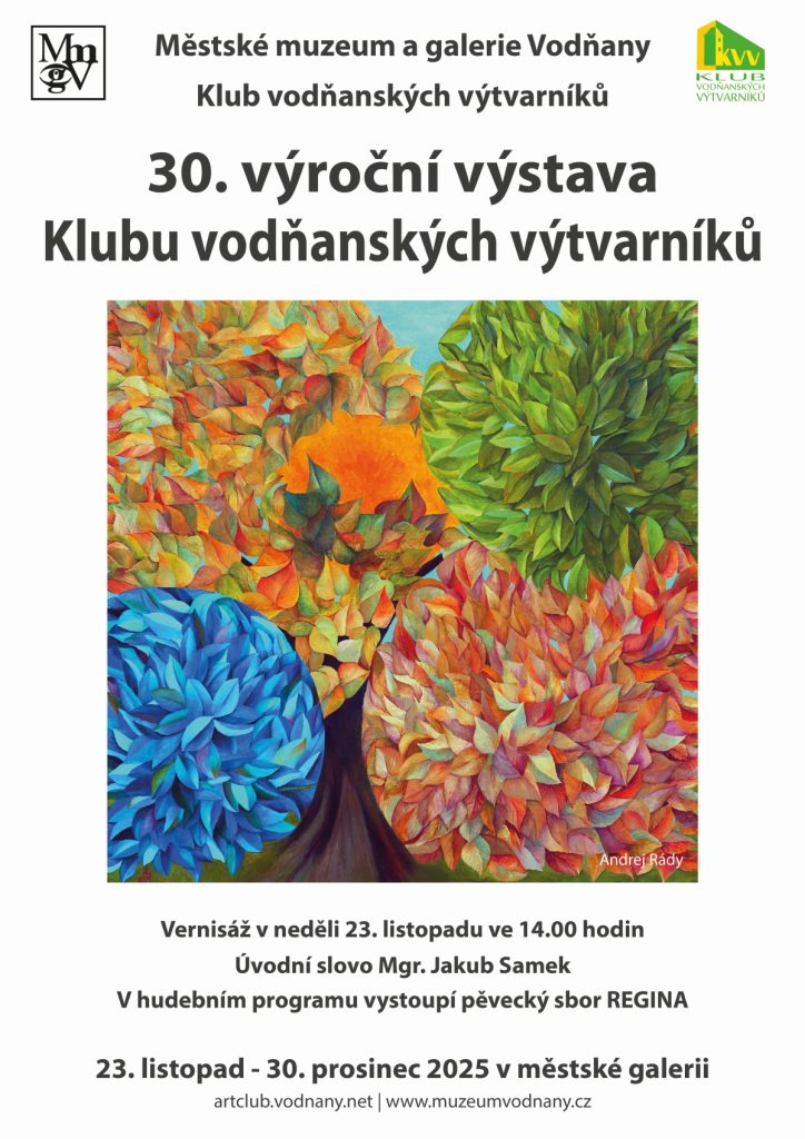 Klub vodňanských výtvarníků slaví 30. výročí výstavou, která bude zahájena vernisáží v neděli 23. listopadu ve 14 hodin v Městském muzeu a galerii Vodňany. Úvodní slovo bude mít Jakub Samek, v hudebním programu vystoupí pěvecký sbor Regina. Výstava potrvá až do 30. prosince.