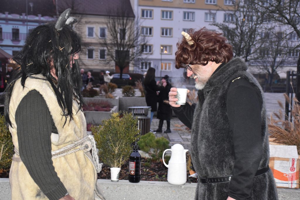 A co se mezitím dělo před radnicí? I tam řádili čerti a Mikuláš s andělem rozdávali dárky za písničky a básničky. Děti byly šikovné a třeba sestřičky Kubíčkovy vystoupily všechny tři – Lily překvapila písničkou od Marka Ztraceného, Sofie prohlásila, že má připravené dvě básničky, a nejmladší Dianka publikum i pobavila, když její verše obsahovaly taky výzvu – kdo makal, ať si sedne… Úsměvně tak připomněla, že je tu čas adventu, a kdo se celý rok nezastavil, měl by to právě teď udělat.