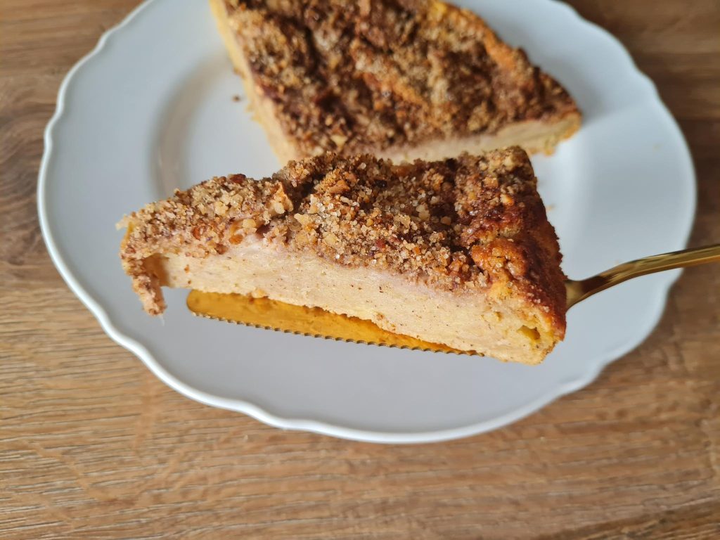 Těsto dejte do připravené formy. Půlku ponechaného jablka nakrájejte na tenké plátky a vyskládejte nahoru na těsto. Posypte 50 g nasekaných vlašských ořechů, polijte javorovým sirupem a posypte lžící třtinového cukru.