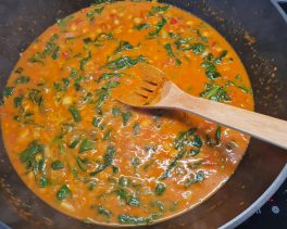 Koření krátce opečte, aby se rozvonělo, a následně vše zalijte zeleninovým vývarem (600 ml).