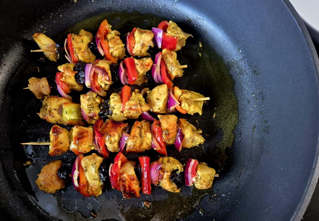 Na špejli pak napichujte střídavě maso, papriku, cibuli a sušené švestky. Špízy opékejte ze všech stran na pánvi s olivovým olejem asi 12 minut ze všech stran.