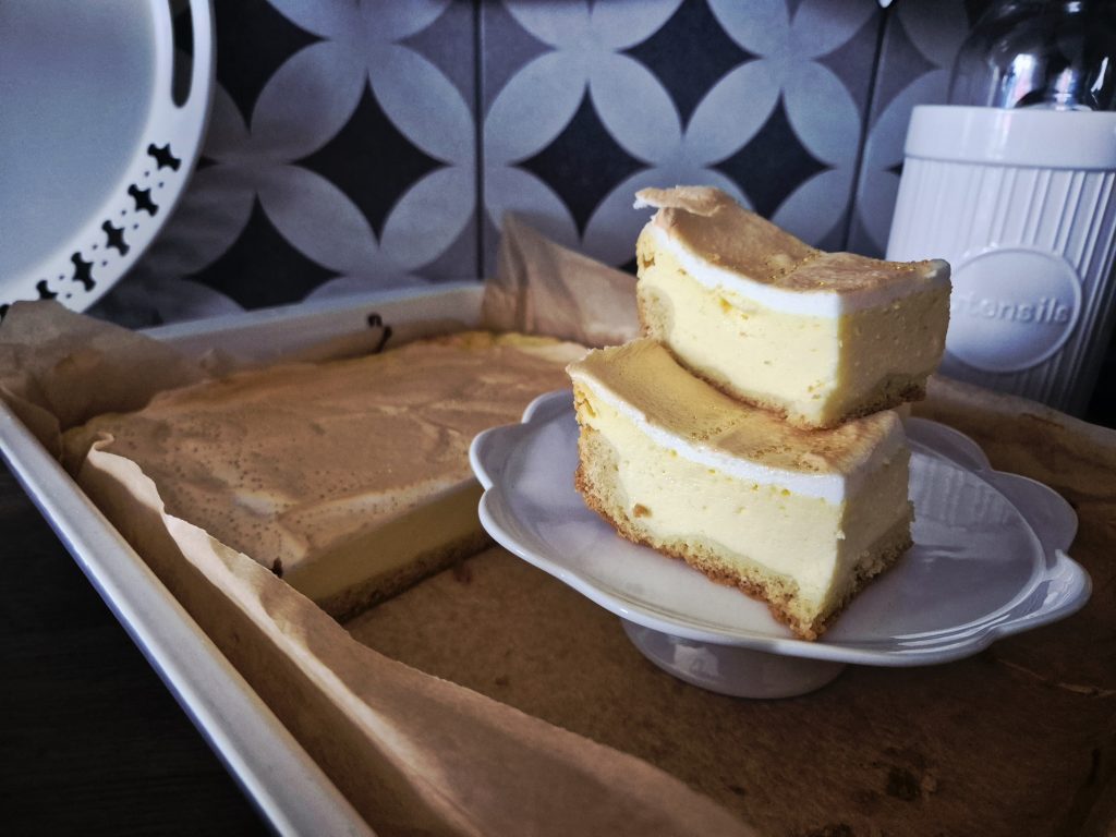 Hotový sníh rozetřete na upečený koláč opatrně zapracujte do tvarohové směsi, aby zůstala co nejvíce nadýchaná.