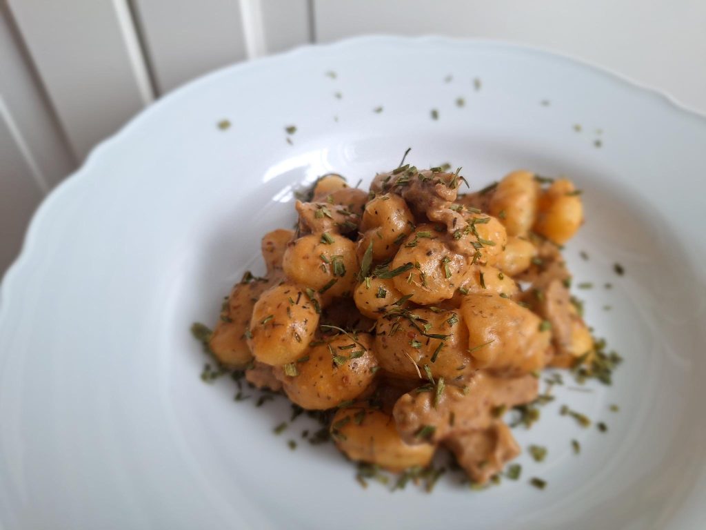 Nejprve si připravte domácí noky. Ve slupce uvařte 600 g moučných brambor a nechte vychladnout. Pak je oloupejte a nastrouhejte najemno. Přidejte 300 g hrubé mouky, lžíci bramborového škrobu, 2 vejce a lžičku soli.