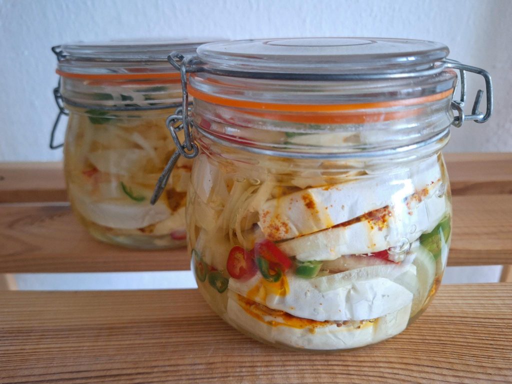 Naskládejte kousky do sklenice, prokládejte je nakrájenou cibulí a pálivými papričkami. Až bude sklenice plná, vše zalijte slunečnicovým olejem.