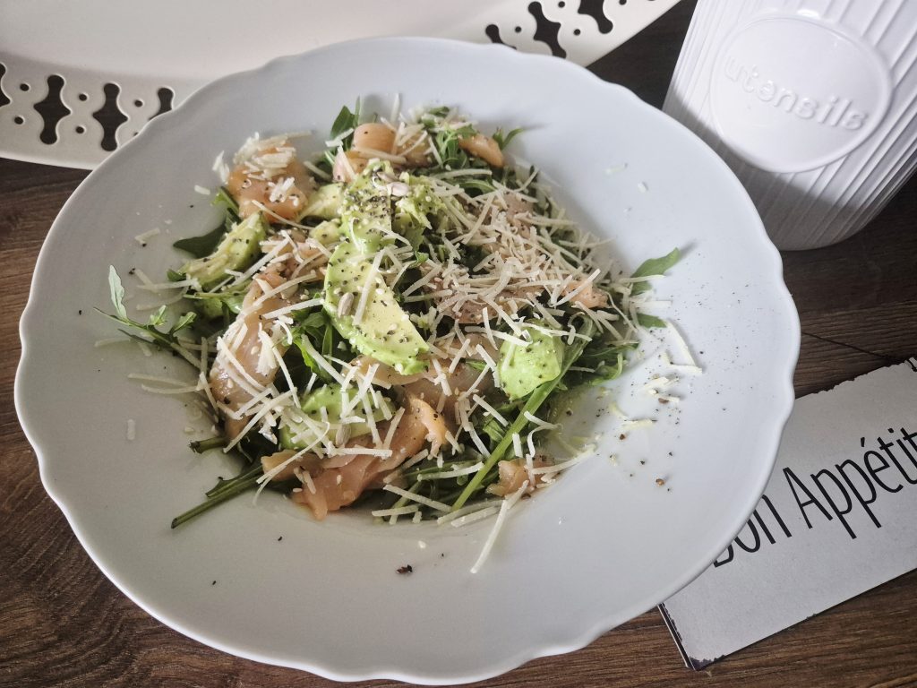 Lehký a sytý salát, který kombinuje chuť uzeného lososa, krémového avokáda a výrazného parmazánu. Rukola dodá příjemnou pikantnost a slunečnicová semínka křupavý kontrast. Ideální volba pro rychlý oběd nebo večeři bez zbytečných složitostí.