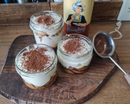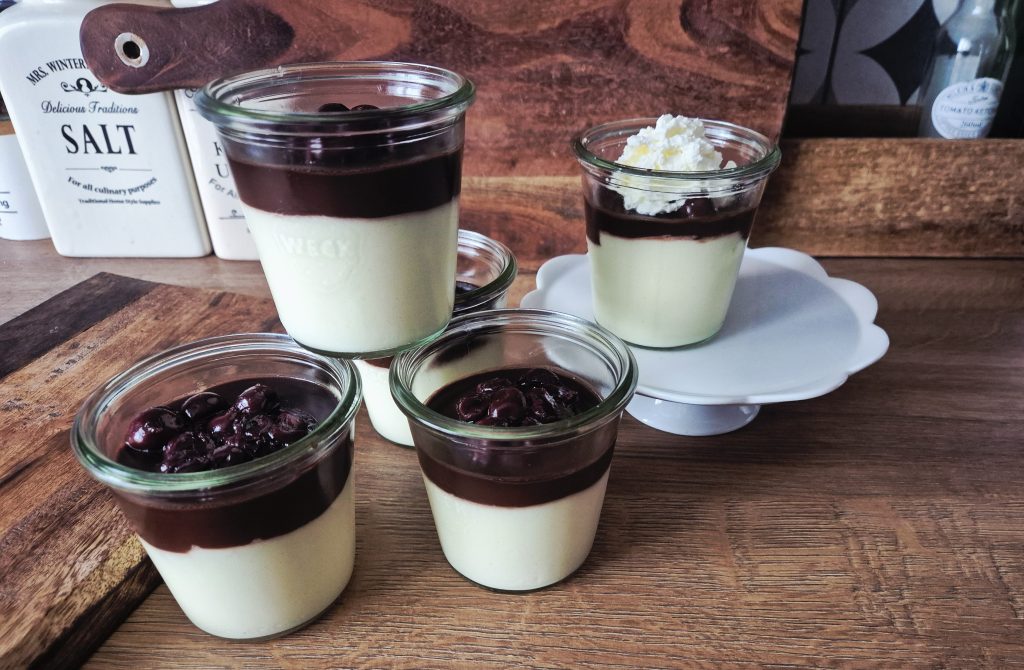 Polevu rovnoměrně nalijte na vychlazený pudink ve skleničkách. Nakonec ozdobte ovocem, já dávala kompotované višně a na ně šlehačku, můžete dát i broskve, meruňky nebo mandarinky.