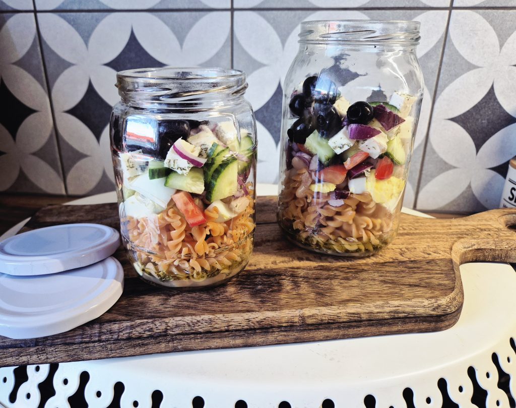 Ingredience (1 porce = 1 sklenice): 2 lžíce olivového oleje, 1 lžíce citronové šťávy, 0,5 lžičky oblíbených bylinek (např. bazalka, oregano, petržel), 50 g vařených těstovin,, 1 vařené vejce, 50 g tuňáka (v konzervě, ve vlastní šťávě nebo oleji), kousek okurky nakrájené na kostičky, 1 menší rajče nakrájené na kostičky, 30 g balkánského sýra, 4 olivy (nebo dle chuti).