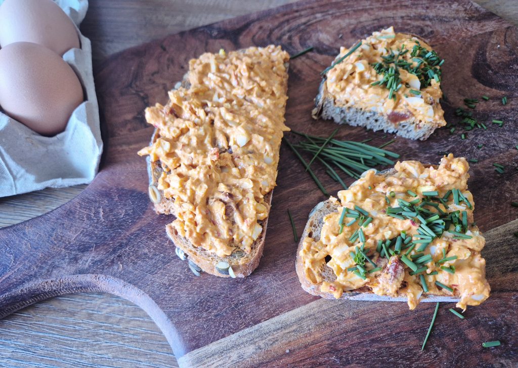 O Velikonocích bývá vajec víc než dost a vajíčková pomazánka je sázka na jistotu. Tentokrát ji ale zkuste trochu jinak – s paprikovou pastou, rajčatovým pestem a svěží pažitkou.