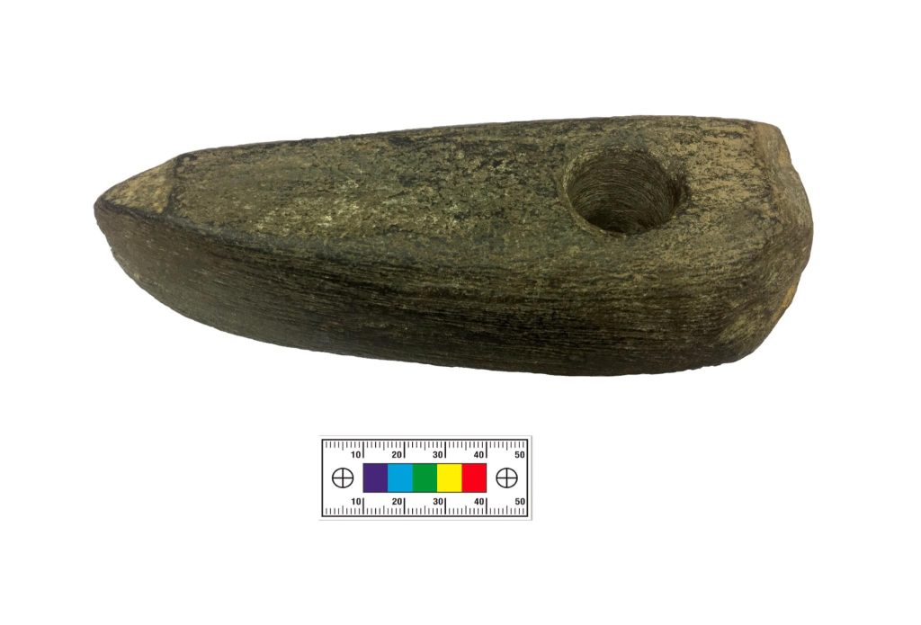 Sekeromlaty se v pravěku využívaly nejen jako pracovní nástroj, ale i jako úderná nebo sečná zbraň. „Tento zajímavý kus broušené kamenné industrie byl vyroben ze zelené břidlice. Je dlouhý necelých patnáct centimetrů a široký čtyři centimetry. Vysoký je téměř pět centimetrů. Kromě téměř hladkého povrchu, který si zaslouží poklonu tehdejšímu výrobci, stojí za pozornost vrtaný otvor o průměru dva a půl centimetru. Do kamene se vrtalo kamenným vrtákem, který se podsypával pískem. Rýhy po vrtání otvoru jsou dodnes patrné,“ popsal ředitel.