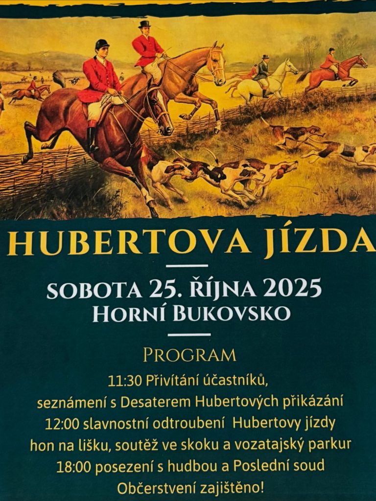 Tady mohou jezdci i diváci zažít tradiční Hubertskou se vším, co k ní odjakživa patřilo – s troubením, čtením Desatera, jehož dodržování se při jízdě přísně sleduje, přírodní skoky na trase jízdy i skoky mohutnosti a vozatajský parkur při občerstvovací přestávce, hon na lišku a večer pak v místní hospůdce poslední soud, kde se prohřešky z jízdy vyhodnotí a hříšníci zaplatí. Hubertská v Horním Bukovsku je vyhlášená a oblíbená, mívá hojnou účast. Organizátoři srdečně zvou.