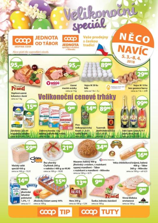 Nabídku obsahuje Velikonoční speciální leták, ve kterém Jednota Tábor inzeruje svou nabídku platnou od 5. března, například česká bílá vejce, uzené maso, Zátkovu mouku, Zárubovu majonézu, jindřichohradecký tuzemák, vlašský salát ze Slap a mnoho dalších akčních velikonočních nabídek.