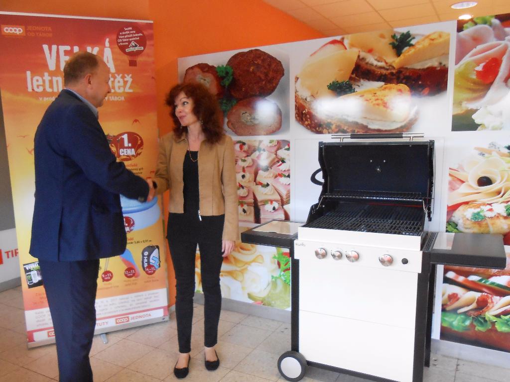 Výhry již byly předány výhercům. První cenu zahradní plynový gril získala paní Irena Hromádková z Tábora. Na přiloženém snímku jí předává hlavní cenu Ing. Vít Sechovec, ředitel družstva. Na otázku, co na výhru říká a jak je spokojena s prodejnou Jednoty, kde nakupuje?, paní Hromádková odpověděla: „Jsem ráda, že jsem vyhrála. Zahradní gril se určitě hodí, často se s rodinou scházíme, tak jej využijeme. Nečekala jsem, že vyhraji. Jsem ráda, že v Jednotě splnili slovo a skutečně ceny předávají svým zákazníkům. Sem do Tipu na Světlogorské ulici chodím ráda, mám to blízko, seženu vše, co potřebuji a ceny mají stejné jako v jiných prodejnách. Jsem tu zvyklá a spokojená.“