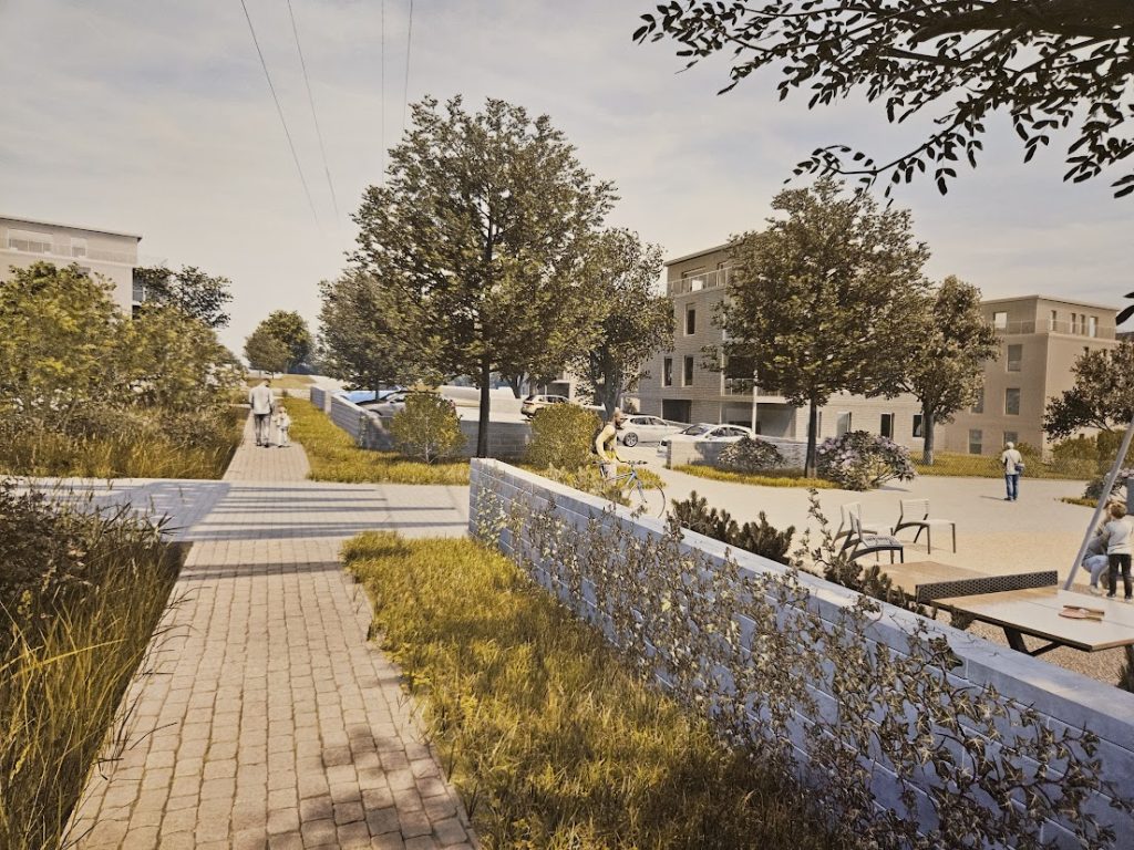 Vítěz soutěže, ateliér tečka z Benešova u Prahy, navrhl čtvrť pro téměř 600 obyvatel. Zahrnuje 56 řadových domů, 19 dvojdomů, deset bytových domů, a další rezidenční objekty včetně bydlení pro seniory či začínající rodiny. Předpokládá použití dřeva a dalších udržitelných materiálů, zelené střechy, chytré systémy parkování (plánuje se 250 parkovacích míst), sportovní zázemí nebo komunitní záhony. Stavby jsou v drtivé většině jen dvou až třípodlažní.