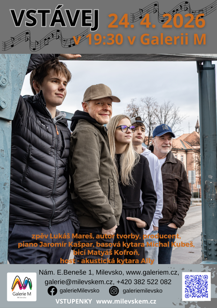 Galerie M srdečně zve v pátek 24. dubna od 19:30 hodin na koncert skupiny Vstávej. Kapela Vstávej hraje melodický český pop a na koncertě nabídne komorní unplugged program.