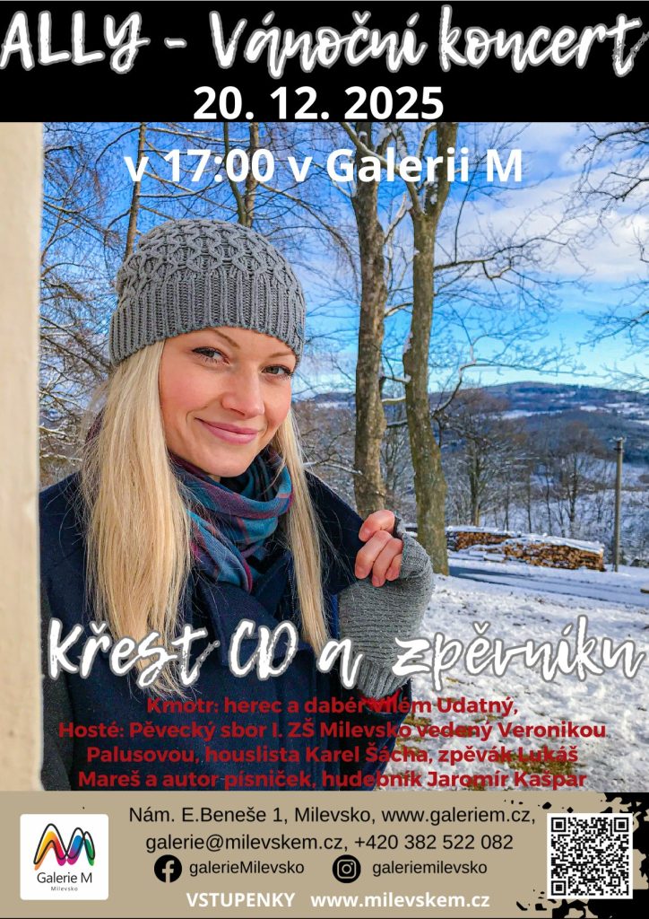 Galerie M srdečně zve v sobotu 20. prosince a v neděli 21. prosince na Ally – vánoční koncert. Zpěvačka Ally vás zve na svůj vánoční koncert, na kterém zároveň pokřtí své CD Vánoční tradice spolu se stejnojmenným barevně ilustrovaným zpěvníkem.