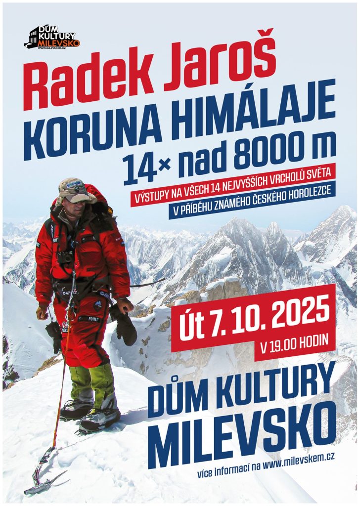 V úterý 7. října od 19 hodin zveme všechny příznivce horolezení na přednášku Radek Jaroš – Koruna Himálaje 14×8000. Radek Jaroš, nejúspěšnější český himálajský horolezec, v roce 2014 dokončil všech 14 osmitisícovek bez kyslíku a nosičů. Stal se prvním Čechem a 15. člověkem na světě s Korunou Himálaje.