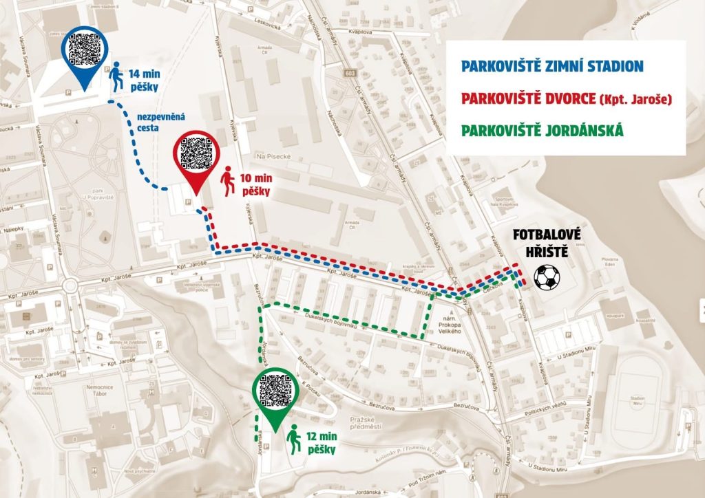 Město proto doporučuje fanouškům využít autobusové linky MHD, zastávka Písecké rozcestí. Zaparkovat mohou řidiči například na ploše před zimním stadionem v ulici V. Soumara, parkoviště v ulici Jordánská Pod Ptákem nebo bývalou vojenskou plochu Dvorce s vjezdem z ulice Kpt. Jaroše v blízkosti Pekárny Wenzel.