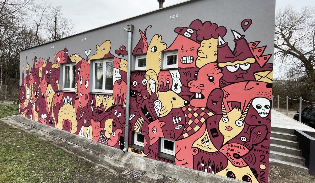 ČESKÉ BUDĚJOVICE – Dopravní podnik města České Budějovice pokračuje ve zkrášlování svých provozních objektů. Nejnovějším přírůstkem do této iniciativy je výzdoba měnírny na Pražské třídě. Malba od známého místního umělce Daniela Kyncla zpříjemní zejména čekání cestujícím na zastávce MHD U Severní zastávky. Inspirací mu tentokrát byli lidé i zvířata, vše doplněno o nejrůznější příšerky a charaktery.