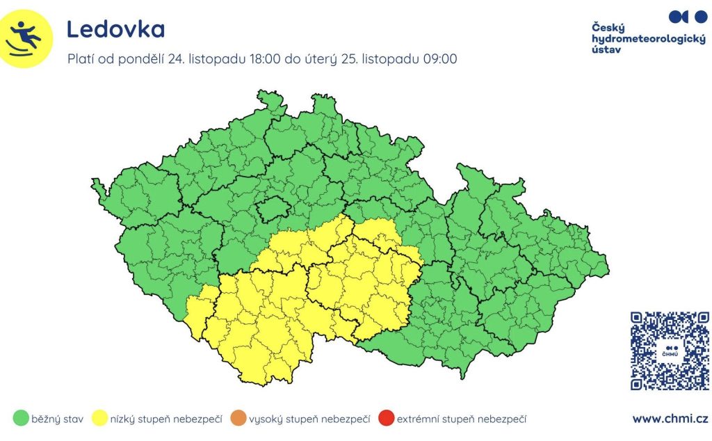 Český hydrometeorologický ústav vydal výstrahu na ledovku pro jih Čech s platností zatím od pondělí 24. listopadu od 18 hodin do úterý 25. listopadu, deváté hodiny ranní. Během pondělního dne může informace upřesňovat.