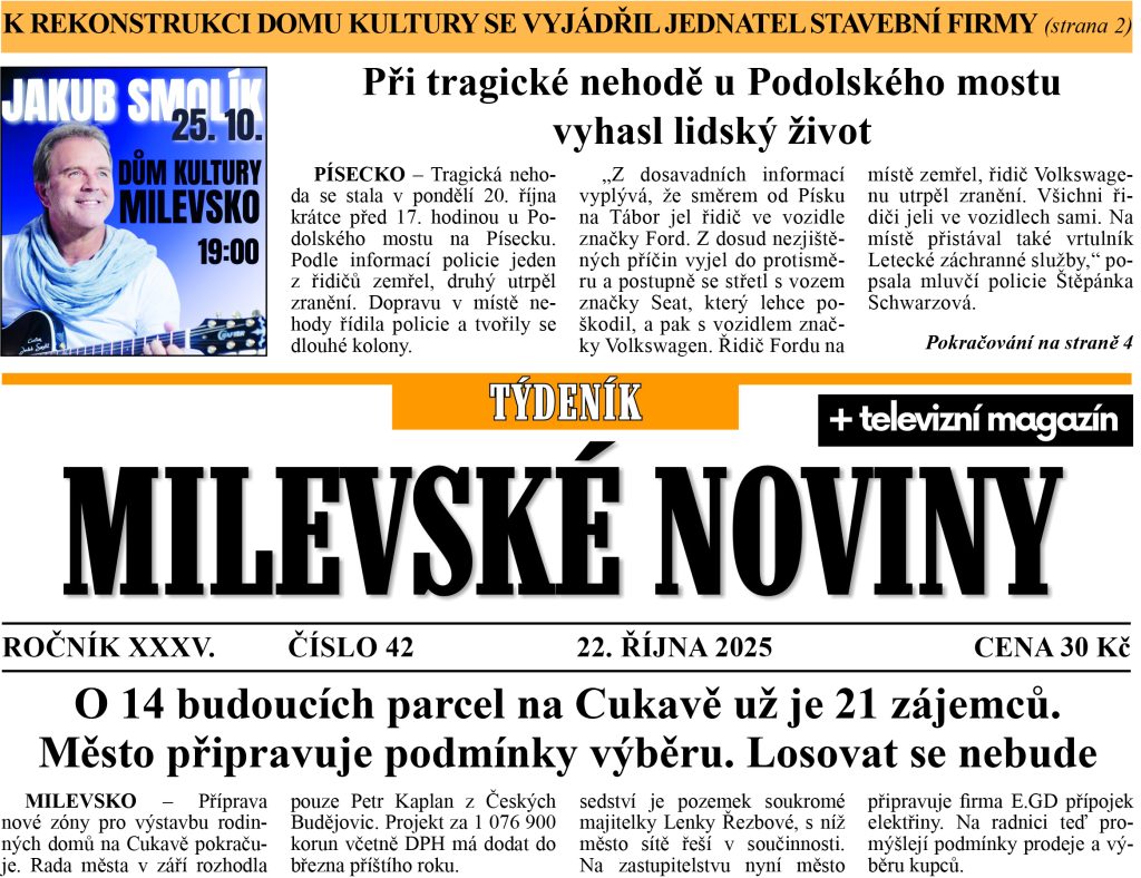Milevští zastupitelé odmítli souhlas s dalším prodloužením rekonstrukce domu kultury. Firmě běží penále. Co zaznělo na zasedání? K situaci se pro Milevské noviny vyjádřil jednatel Karel Vácha ze společnosti Stavitelství Karel Vácha a syn ■ O 14 budoucích parcel na Cukavě už je 21 zájemců ■ Staré sídliště je bez tepla ■ V Hrejkovicích řešili zastupitelé osud prodejen. Koupí je obec? Dozvíte se ■ Firma Daich rybník v Hněvanicích neopraví. Nastoupila firma Hora ■ Dieta je pro Zdeňka Trošku sprosté slovo, řekl ve Zbelítově ■ Firma Strom čeká v Bernarticích na geologický průzkum ■ Potvrdili fotbalisté venkovní body doma proti Doubravce? ■ Hokej: Třetí výhra v řadě, pak odložený zápas ve Vrchlabí ■ Milevské házenkářsky přijaly pozvání hejtmana kraje