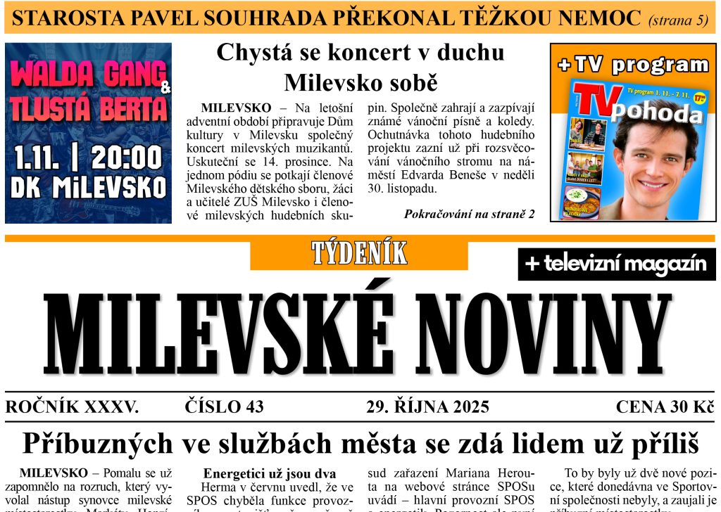 Příbuzných ve službách města se zdá lidem už příliš ■ Milevsko vzdalo hold svým osobnostem ■ Pavel Souhrada překonal těžkou nemoc. Bude znovu kandidovat? Přinášíme obsáhlý rozhovor s bernartickým starostou ■ V Sepekově měřili frekvenci i rychlost dopravy. Jeden výtečník jel obcí i stodvacítkou ■ U Zvíkovského podhradí bude kruhový objezd ■ Hrejkovičtí hasiči budou mít novou cisternu ■ Atlet Pavel Fleischmann na Madeiře překonal národní rekordy ■ Florbalisté vyhráli pošesté v řadě a vyhřívají se na čele divizní tabulky ■ Vítězné derby! Hokejisté Milevska porazili Písek