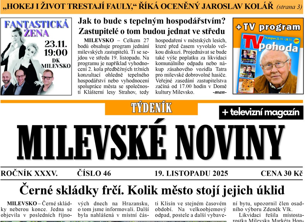 V okolí Milevska se objevila další černá skládka. Kolik stojí město jejich úklid? ■ „Hokej i život trestají fauly,“ říká letos oceněný Jaroslav Kolář. ■ Na mostě v Sepekově finišují stavební práce ■ Ve Slabčicích budovu Jednoty nekoupí. V ohrožení je i pobočka pošty ■ Mladí výtvarníci převzali v Petrovicích ocenění ■ V Branicích jsou s fotovoltaikou spokojení. Přinášíme rozhovor se starostou Stanislavem Češkou ■ Jak je to s energetiky v Milevsku se zamýšlí ve svém příspěvku Josef Pavlík ■ Fotbalisté Milevska zakončili historický rok 2025. Jak se jim povedla derniéra s Komárovem? ■ Hokejisté prohráli doma v základní části po čtyřech letech ■ Julie Pejšová po reprezentační premiéře s čistým kontem: Cítila jsem, že mají spoluhráčky upřímnou radost