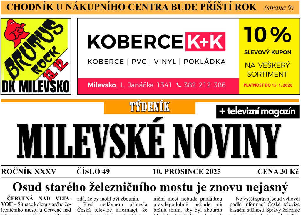 Osud starého železničního mostu u Červené nad Vltavou je znovu nejasný. Kdo usiluje o jeho zbourání? ■ Chodník u nákupního centra v Blanické ulici se bude stavět příští rok. Do kdy bude hotov a kolik bude stát? Dočtete se ■ Mikuláši, čerti a andělé ovládli region a konala se spousta dalších akcí. Přinášíme zprávy z druhého adventního víkendu ■ Jaké budou priority roku 2026 v Kovářově? ■ Nový poslanec Martin Kupec zahájil svou práci ve sněmovně. Čím chce být prospěšný regionu? Dozvíte se v rozhovoru ■ V Sepekově žádají o dotaci na rekonstrukci víceúčelového hřiště ■ Bernartická fara potřetí ožije adventním programem ■ Sedm vystavujících v milevské galerii M spojila základní umělecká škola ■ Branický rodák Josef Žižka oslaví sedmdesáté narozeniny ■ Hokej: Julie Pejšová s Terezou Pištěkovou jsou v reprezentaci ■ Hokejisté Milevska po výhře s Kadaní přivezli bod z Kralup. Kdo si říká o Tábor?