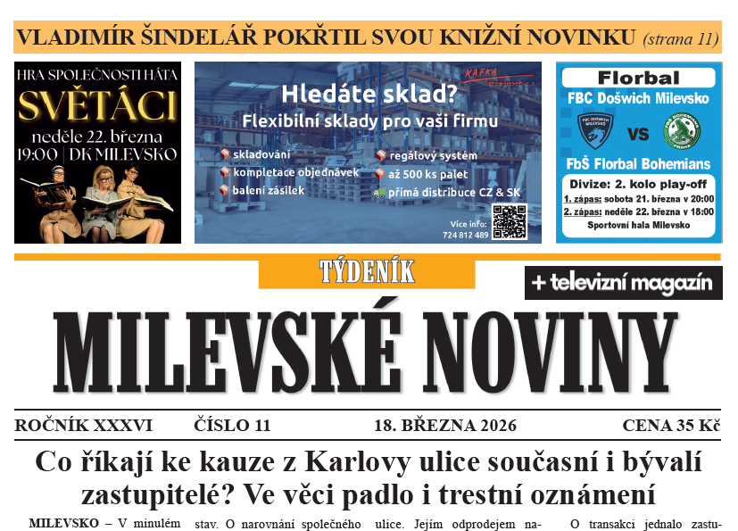 Co říkají ke kauze z Karlovy ulice současní i bývalí milevští zastupitelé? Dočtete se ■ „Byl bych rád, kdyby se lidé více ptali, aby se nešířily fámy,“ říká starosta Sepekova Michal Koutník v rozhovoru ■ Podle místostarostky Markéty Honzíkové je největším milevským nešvarem parkování vozidel na zeleni ■ Zlepšila se situace s problémovými lidmi na bernartickém náměstí? ■ Na směně býval kdysi jen jeden hasič. Na začátky milevských profíků zavzpomínali hasičtí nestoři Ladislav Cigler a František Kabele ■ Milevští zvítězili v Senior kvíz tour ■ Okresní pohárová soutěž hasičů Písecka má termíny. U mládeže přichází novinka ■ Florbalisté udělali s Trutnovem rychlý proces a postupují ■ Hotovo do poločasu. Fotbalisté Milevska padli ve Štěchovicích ■ Moderní gymnastika: Milevšťandy v Praze získaly kompletní sbírku medailí