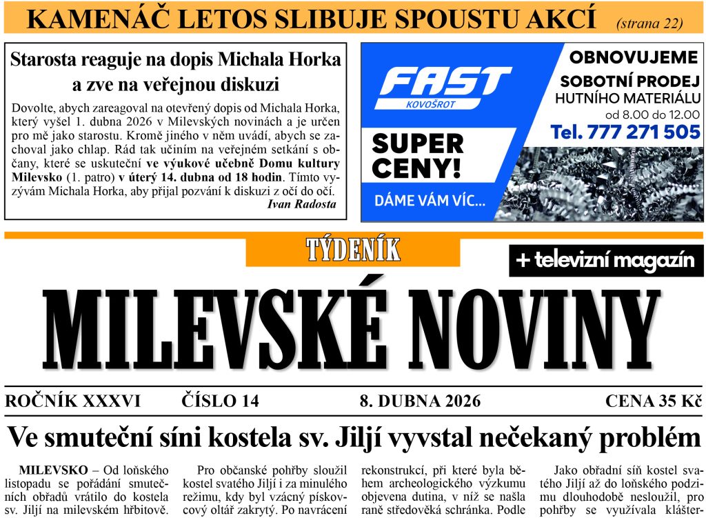 O stavbu nového pavilonu školky Sluníčko jsou čtyři zájemci ■ Jak Gabriela Zítková bilancuje první období na kovářovské radnici? Dočtete se v rozhovoru ■ Ve smuteční síni kostela sv. Jiljí vyvstal nečekaný problém ■ Znovuotevření prodejny v Kučeři si lidé pochvalují ■ „Milevský Kamenáč bude dál dávat šanci mladým muzikantům,“ říká v rozhovoru Daniel Hruška ■ Kostelec nad Vltavou slavil: Zbrojnice je po rekonstrukci znovu otevřena, Tatře 815 bylo požehnáno ■ Klisinečtí předvedli v Hrazánkách divokou módní přehlídku ■ V Křenovicích soutěžili o nejhezčí pomlázku ■ Tanečníci z EFK odstartovali sezonu, zvládli dvě soutěže za den ■ Fotbalistům Milevska pomohl k zasloužené výhře nevídaný vlastenec ■ Stolní tenis: Kovářovské ženy v sobotu zabojují o postup do první ligy ■ Florbalisté senzačně vyřadili Bohemians. Jak si vedou v sérii o Národní ligu?