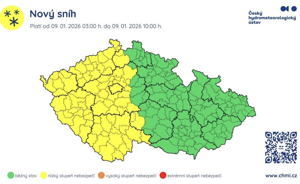Noc na pátek 9. ledna už tak chladná nebude, přinese ale vydatné sněžení. „Ve druhé polovině noci a v pátek ráno a dopoledne očekáváme zejména v západní polovině a na jihu Čech výraznější sněžení. Na západě Čech může napadnout osm až 13 centimetrů nového sněhu s přechodnou intenzitou až tři centimetry za hodinu během ranních hodin. Na ostatním území s platnou výstrahou předpokládáme pět až deset centimetrů nového sněhu s přechodnou intenzitou i kolem dvou centimetrů za hodinu,“ informuje Český hydrometeorologický ústav a upozorňuje, že vzhledem k záporným teplotám vzduchu i povrchů, kdy nebude sníh odtávat a době nejvýraznějšího sněžení na mnoha místech před a během ranní dopravní špičky, se dají předpokládat výraznější komplikace v dopravě.