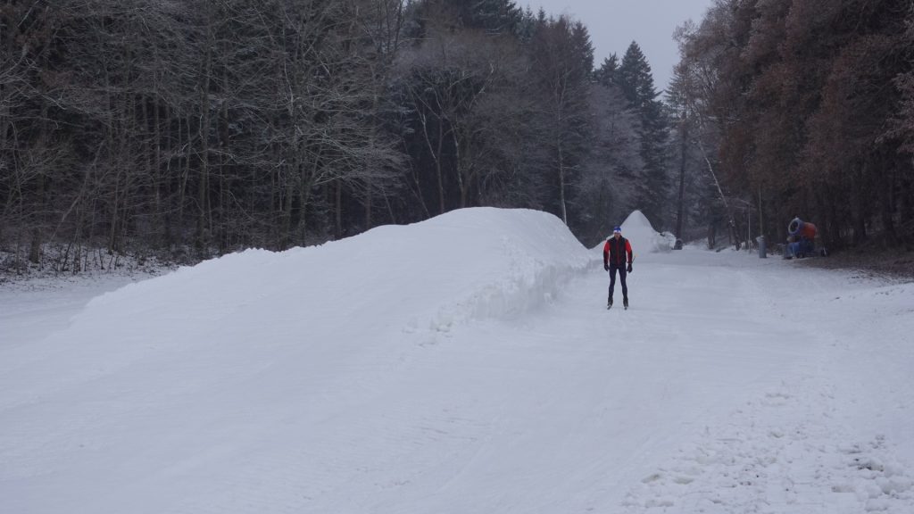 Hromady umělého sněhu rolby rozhrnuly zatím do malého, asi dvousetmetrového okruhu. Příležitost k první projížďce už si nenechali ujít první nadšenci. Příprava delších tratí a stop začne až sněhu opět přibude. Chladné mikroklima údolí Křesanovského potoka umělému nasněžování do zásoby svědčí.