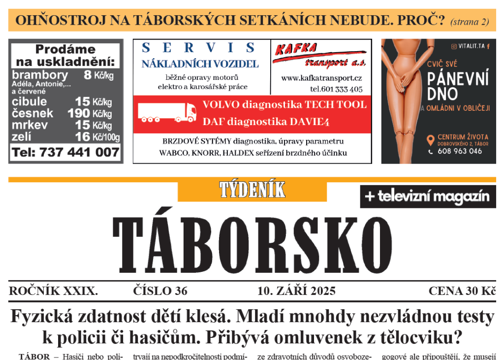 Zrušení popíjecí vyhlášky v historickém centru Tábora opozice neprosadila. Chyběl jeden hlas ■ Táborská setkání jsou za dveřmi. Proč nebude ohňostroj? ■ Na zubní pohotovosti nesmí vybírat víc než poplatek 90 korun ■ V Sezimově Ústí se ujal Běhochod – společný závod psů a pánů ■ Na Tabooku o komiksech ■ Signály o konci obalování učebnic a sešitů. Je za tím lenost nebo ekologie? ■ Táborští veslaři se ukázali na srpnových regatách ■ Prvoligoví hokejisté Tábora prohráli generálku s Třebíčí v prodloužení ■ Fotbalistky Táborska urvaly i druhý zápas nové sezony