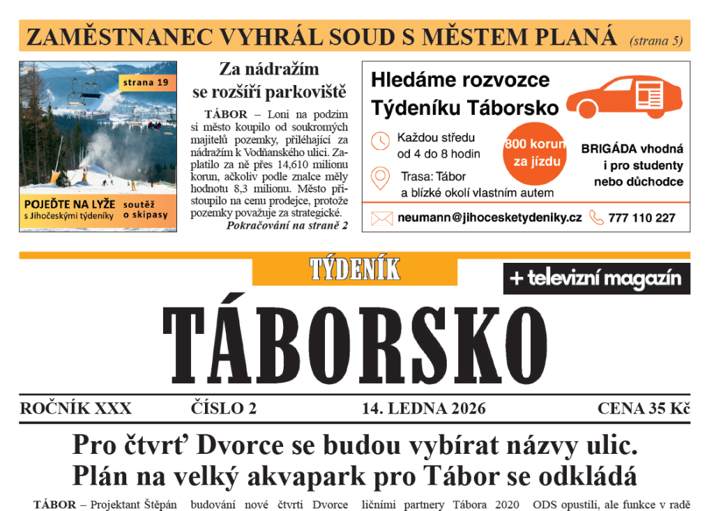 Táborsko shrnuje dostupné informace ke změnám na radnici v Soběslavi. Je to převrat? ■ Kolem peněz pro hokej a fotbal se čeká v Táboře debata. Známý už je termín otevření druhé ledové plochy ■ Propuštěný redaktor Plánských ozvěn vyhrál soudní spor s městem ■ První člověk umrzl. Rozhýbou se táborské instituce k pomoci lidem bez domova? ■ Tábor už nemá romského asistenta prevence kriminality. Jen ukrajinského ■ Zasoutěžte si o skipasy ■ Dvougólový náskok proti Slavii kohoutům nestačil ■ Hokejisté Lokomotivy dotáhli s rezervou Milevska dvoubrankovou ztrátu ■ Cyklokrosař Michael Boroš ze zdravotních důvodů český titul neobhajoval