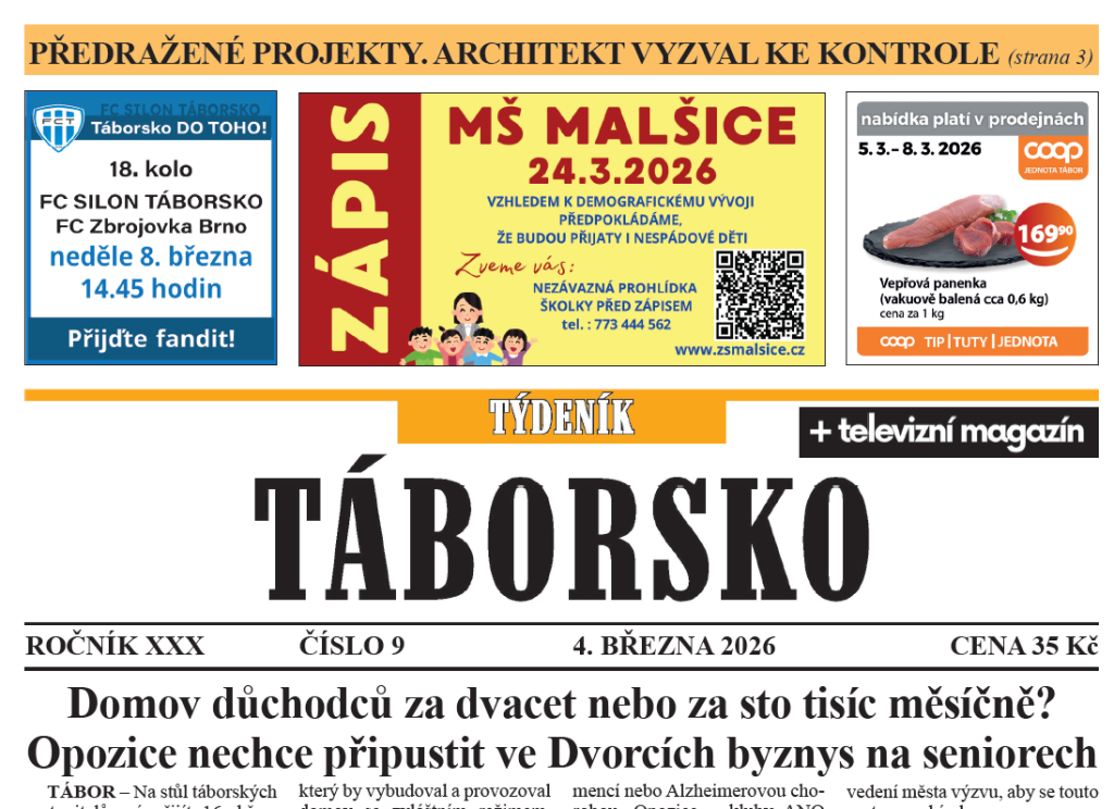 Architekt Martin Jirovský poukázal na předražené projekční zakázky v Táboře. Chce, aby věc prověřil kontrolní výbor ■ V Sezimově Ústí se znovu řeší ulice Rudé armády ■ Na opravu zničené lávky nad Lužnicí u Bechyně už jsou peníze i firma ■ Do Veselí míří spisovatelka, která ztratila iluze o rozvojové pomoci pro Afriku ■ Co se podařilo zjistit o působení gestapa v Táboře, o tom byla beseda v Husitském muzeu ■ Hokejistu Radkova zachránil defibrilátor ■ Kohouti ztratili první utkání předkola s Třebíčí v prodloužení ■ Druholigové Táborsko rozjelo jarní boje porážkou ve Vlašimi ■ Divizní Soběslav plánuje bojovat o třetí místo