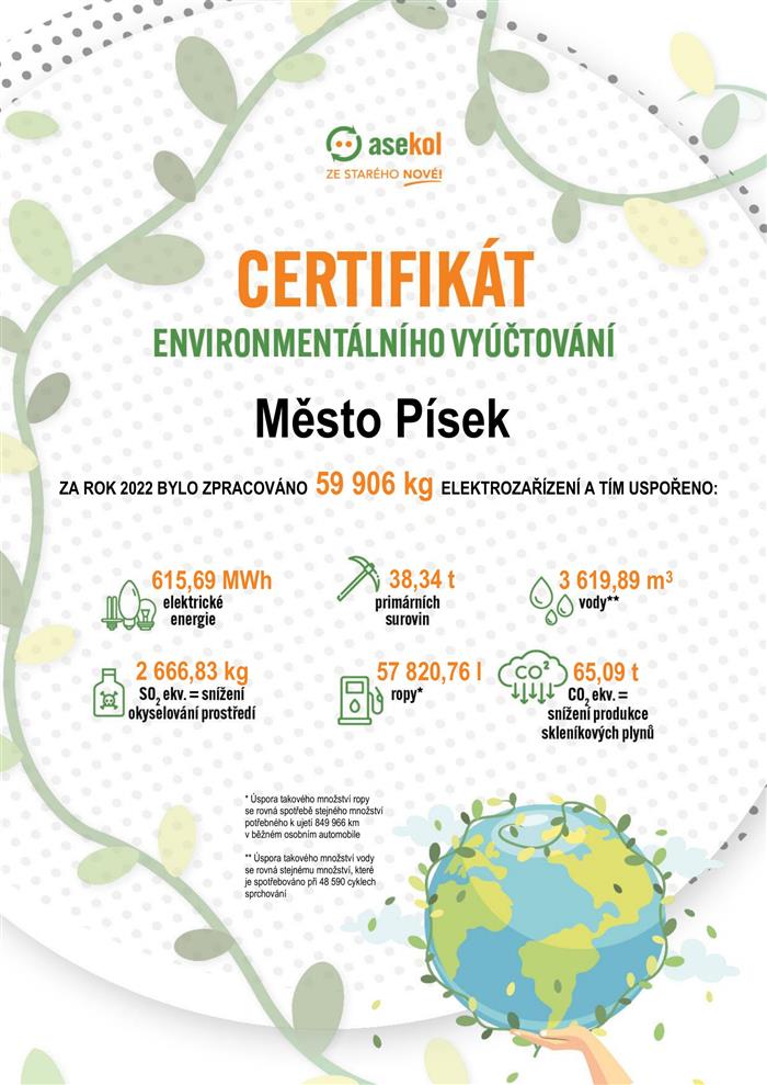 Certifikát environmentálního vyúčtování vyčísluje přínos města k ochraně přírody v roce 2022. Vyplývá z něj, že díky množství odevzdaných elektrozařízení obyvatelé Písku uspořili 615,69 MWh elektřiny, 57 820,76 litrů ropy, 3 619,89 m3 vody a 38,34 tun primárních surovin. Navíc se díky nim snížila emise skleníkových plynů CO2 ekv. o 65,09 tun a produkce SO2 (který zapříčiňuje okyselování prostředí) ekv. o 2 666,83 kg.¨