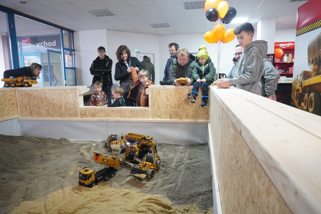 Pískoviště uvnitř prodejny nářadí. Bagry na ovládání lákají děti i tatínky